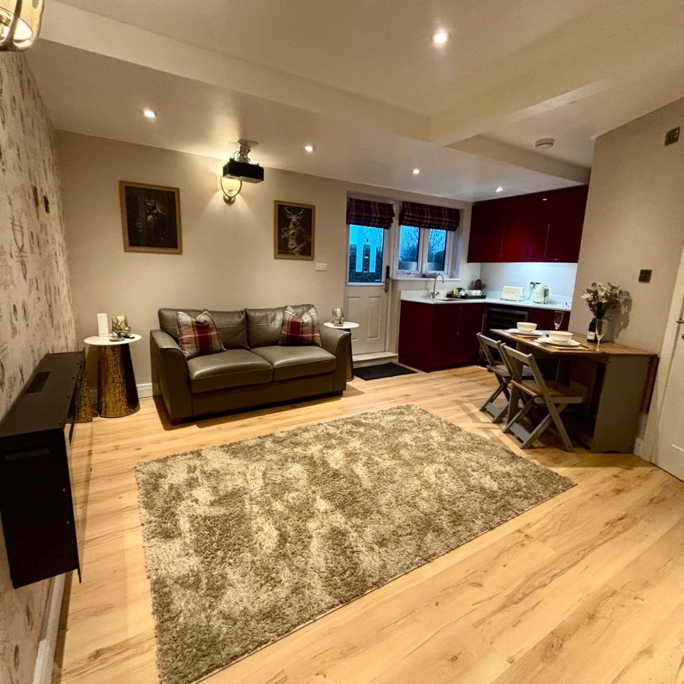 Relax in a comfortable lounge area featuring a sofa bed and TV — perfect for unwinding after a day out. The kitchenette includes a fridge and stylish SMEG appliances, along with a coffee machine and complimentary tea and coffee facilities.